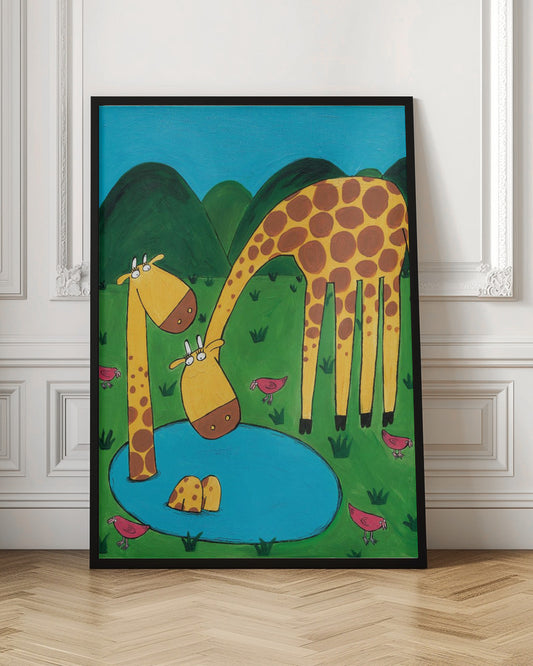Mommy with Baby Giraffe in a Watering Hole by Artist Carla Daly - Poster / Art Print